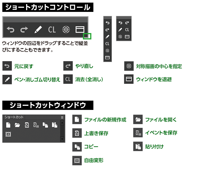 作業を効率化するショートカットコントロールとウィンドウ。ショートカットコントロールは半透明でサイズ変更も可能なので、作業を邪魔することなく手元に置いておけます。