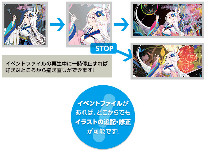 イラストの描き手順を記録/再生する「イベント(描画再生)機能」。イラストを描いた手順、使用したツールが記録されます。イベントファイルがあれば、どこからでもイラストの追記、修正が可能になります。また、描いた手順をGIF動画にすることもできます。